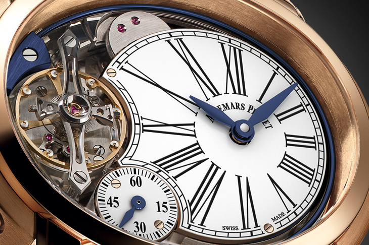 Millenary Minute Repeater具有立体3D结构设计,在横椭圆形表壳内,可欣赏到突显精准和复杂机芯工艺的爱彼独家擒纵系统、双游丝设计,以及敲击报时装置的音锤和音簧。