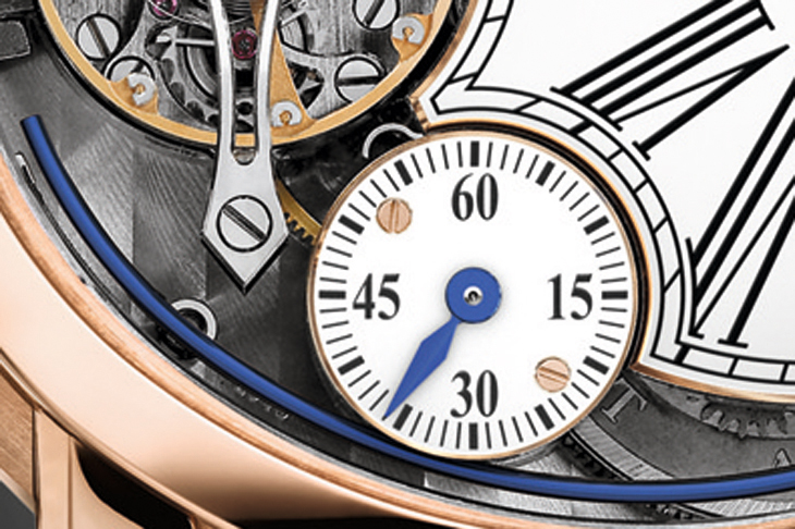 与蓝色音簧作出对应色调的偏心小秒指针,在玫瑰金的表体中更显高贵,伴随着爱彼特制的半鏤空面盘处理,更显精致万分。