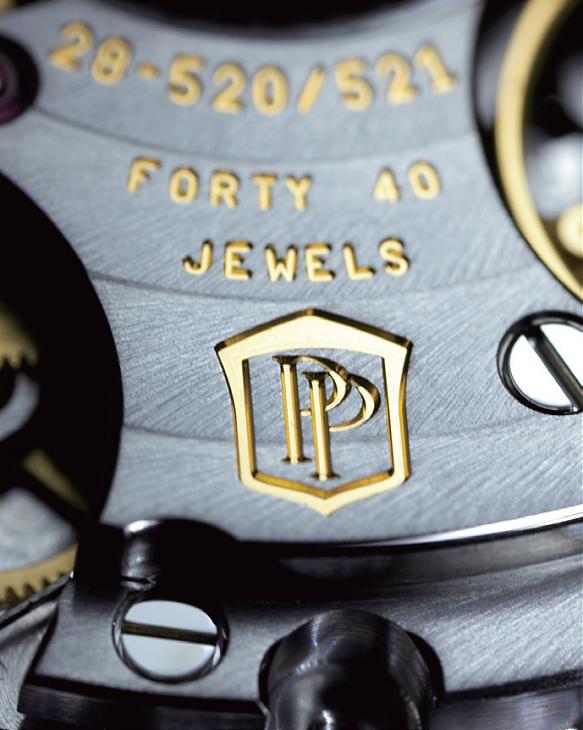 百达翡丽印记以俐落的盾牌外框搭配内部的PP 叠字造型,鐫刻在基板上显得一目瞭然。