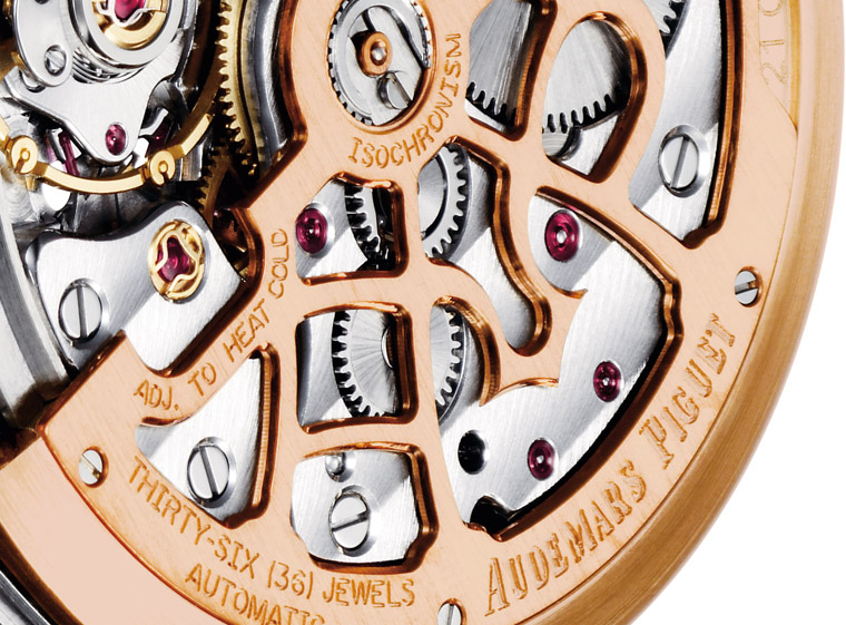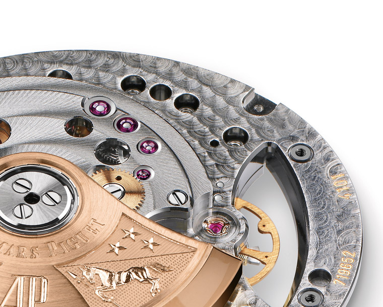 爱彼的「扭转乾坤」机芯在中层夹板上有大量的珍珠纹,即使遇到螺纹孔洞仍不影响其纹路连贯性。
