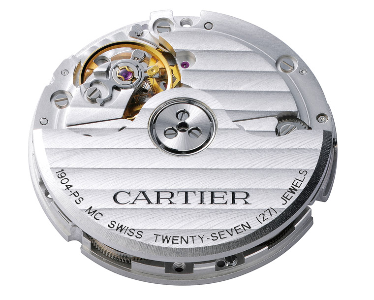 卡地亚的机芯作品在基板与自动盘上皆施以大块的横向日内瓦波纹,达成视觉上统一的层次。