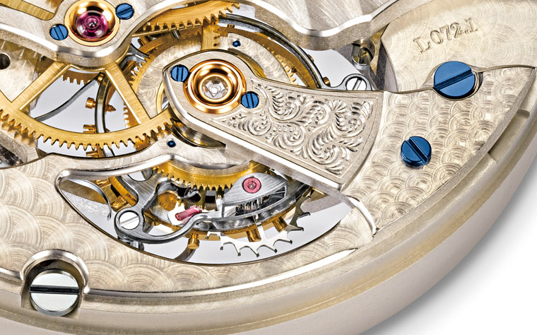 朗格随夹板尺寸採不同直径的珍珠打磨,另外在擒纵支撑桥板上的雕花则是德系品牌的特色。