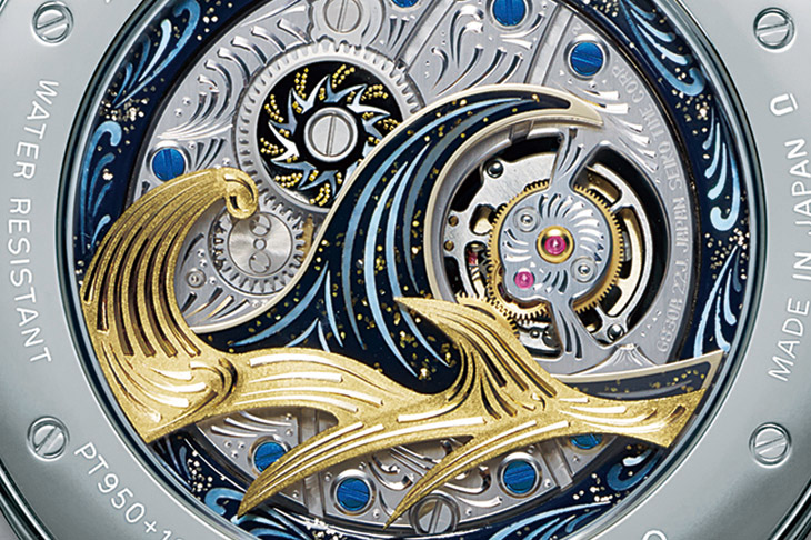 着名的波浪图案由金雕名匠照井清以立体雕金技法雕刻。黄金与白金的色泽交错突显远近构图。最厚处约1.6mm,最薄处约0.5mm,凭指尖手感雕制而成。