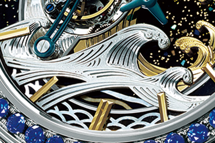 无独有偶,2016年巴塞尔表展上,除了BLANCPAIN外,还有另一家品牌CREDOR同时援引了同一幅画作——《神奈川冲浪里》作为创作发想,这是相当有趣的现象。这也证明了近来日本传统工艺在西方表坛的热度已然加温。CREDOR成为下一个临摹《神奈川冲浪里》的追随者,巧弄雕金、漆艺等技艺,让东西方工艺的衝突火花为新作带来话题!