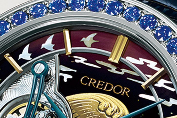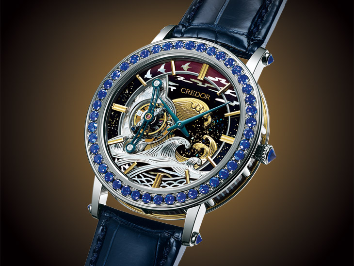 为了衬托这赏心悦目的外观,表款更採用超薄设计。内部搭载的6830手动上鍊机芯是以超薄机芯68为基础,进而开发出的首款CREDOR陀飞轮机芯。厚度不到4mm,轻薄零件组装难,因此严格考验组装师,其由现代名工平贺聪打造。表款一只参考价格约逾台币一千五百万元,全球限量8只,为收藏家之选。
