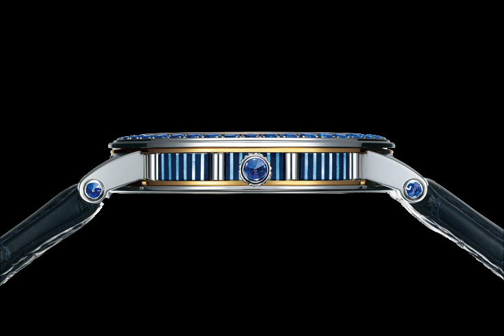 藉超薄机芯之利,整只表作的外在视觉美感更为突出。表圈镶嵌了48颗蓝宝石,为黑色盘面加添稳重感。表壳侧面还有蓝色珍珠母贝饰板,颇有新意。