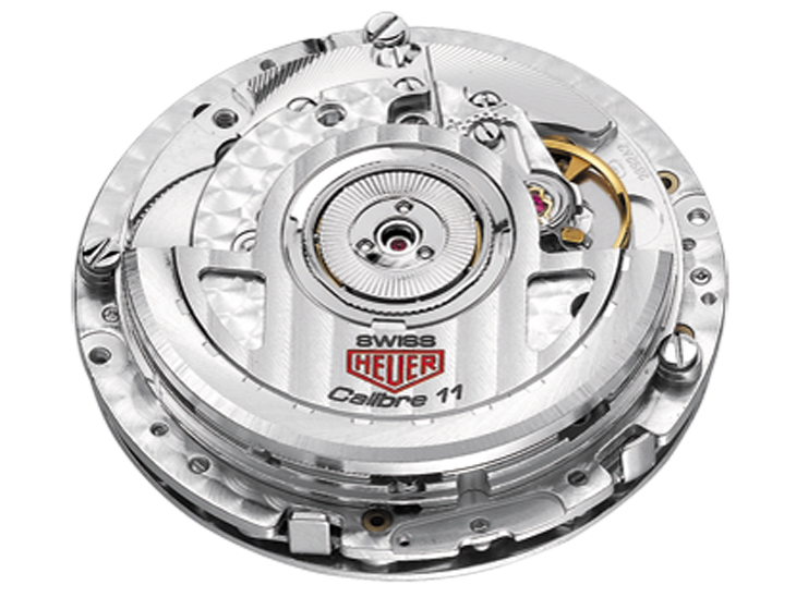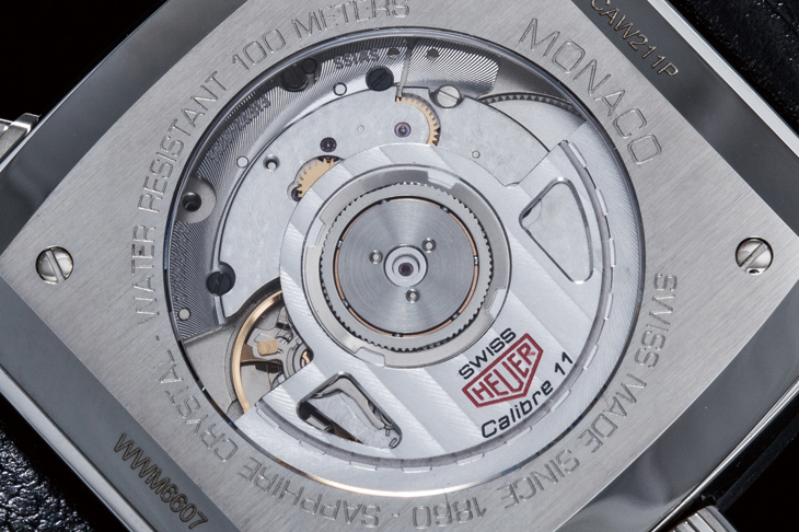 Calibre 11是1969年Monaco 1133B面世时同时推出的机芯,具有「世界上第一枚自动上鍊计时腕表机芯」,以及「世界上第一只方形表壳计时码表」的双重意义。2009年豪雅特地将Calibre 11再版重现,并且打造了Monaco 1133B的復刻纪念作,此次依然沿用在新作之中,鏤空自动盘上,也鐫刻了復古的豪雅Logo以及Calibre 11机芯名称,在透明表背下将这个赛车界、电影界、制表界都拥有热度的话题持续延烧。