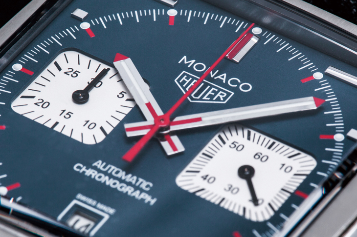 面盘12时时标下方的豪雅Logo,可以说是復刻表款的身分徽章。因为品牌Logo早已更改,新的Logo加入了TAG集团的名称,而且五边形的边框样式上下分割、左右压缩而显得更趋方正。这种长型的Logo是早期的豪雅表上才有的,无论是'09年的復刻版或者是'15年的復刻版都忠实原型,1998年以后新款摩纳哥腕表上棒状时标的放射排列,也改回横向错落的样子,前缀的点状时标,也用了和原型款上一样、模仿汽车仪表板的白点加上红色槓。