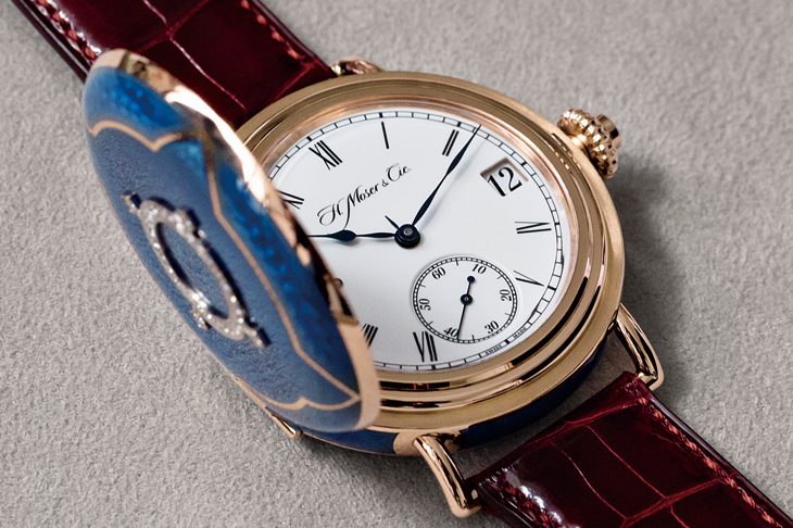 H. MOSER & CIE.在2016日内瓦表展上推出一只Perpetual Calendar Heritage限量版腕表,以19世纪品牌所制作的怀表做为灵感,运用掐丝珐琅技法制作怀表式双盖表壳,復刻出H. MOSER & CIE.的经典灵魂,内部搭载着品牌最新式的纯金手动上鍊机芯,将百年传统结合现代技术,这除了是向品牌万年历腕表10週年致敬,更是象徵着瑞士顶级制表业的传承延续。 面对近年来的智能腕表风潮,H. MOSER & CIE.在'16年S.I.H.H.除了推出一只外型宛如智慧表、带有浓厚反讽意味的Swiss Alp Watch机械表,同时推出这只能够彰显传统制表工艺的限量作品Perpetual Calendar Heritage限量版腕表,搭载着与Endeavour Perpetual Calendar系列相同的HMC341原厂机芯,双发条盒让腕表拥有至少7天的动力储存能力,然而不同于标准版的设计,Heritage限量版腕表所搭载的HMC341机芯以18K金打造,机芯上更镶嵌着2颗托钻,尽显奢华。Perpetual Calendar Heritage限量版腕表保留了经典怀表的特色,以掐丝珐琅打造表壳、表盖,再以手工鐫刻Guilloché扭索纹装饰,侧边表盖镶饰着璀灿的钻石,更加突显Heritage限量版腕表宝蓝色调的优雅贵气,如同古董时计,Perpetual Calendar Heritage限量版腕表也备有双拉式表冠,并有开啟正面表盖的单按把机制。不同于原版怀表的设计,Perpetual Calendar Heritage限量版腕表尺寸加大,使得表耳更显细长,搭配上鱷鱼皮表带为经典风格带来新的詮释。除此之外,掀开表盖,大明火珐琅面盘上採用轨道式刻度搭配上燕尾型指针,呼应传统;而3点鐘方向的大日期窗、6点鐘方向具停秒功能的偏心秒盘与9点鐘方向动力储存指示,以及面盘中央以时标指示月份的小指针设计都与Endeavour Perpetual Calendar系列相同,H. MOSER & CIE.以现代技术重释古典风华,再现顶级制表工艺无可取代的奢华价值。