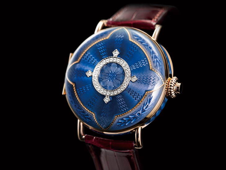 以5N红金材质所打造的Perpetual Calendar Heritage限量版腕表,採用双盖式设计,表壳表盖皆运用掐丝珐琅装饰,彷如古典怀表。