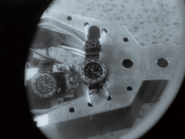 在1983年的深潜测试中,採用将两只600米深潜腕表绑缚于舱外的方式,除了影像监控,测试人员也可以直接由窗口观测到腕表情况。