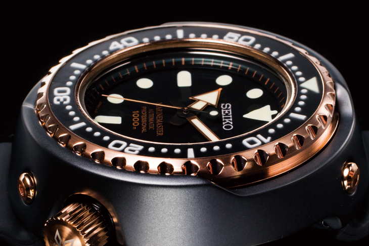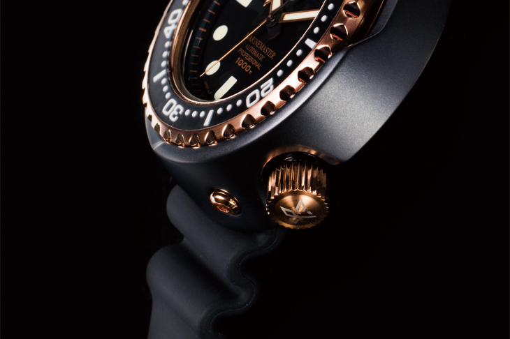 由于1975年首作即掌握了陶瓷硬质涂层的技术,加上1978年注入可以调色的IP离子涂层处理,玫瑰金色旋转外圈、黑色外层保护壳,这样的搭配从1978年便延续至今,不仅是经典设计,也算是表款发展的一份纪念意义。2015年系列推出届满50年,SEIKO在BASELWORLD表展也先推出黑金配色表款,后来才推出限量的特殊色"Gold Ocean"跟"Platnium Ocean"。2013年SEIKO逢100週年纪念时,也有在此系列推出纪念款,当时也是以黑色为底,将玫瑰金色涂层部份调整为黄金色,可以想见黑金配色之于专业海洋大师的独特地位。此外,'15年新作也继承了品牌百週年纪念作针对时标造型做出的调整。从1975年到2013年,系列表款的时标,除了萤光涂料的轮廓线之外,都还多了一圈细线勾勒,看起来有些科技感的装饰,在100週年的纪念作后,将双线轮廓改为单线的时标,整体视觉上看起来更加简洁清晰。