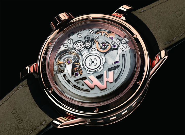 为了要呈现独特的跳时、跳分功效,DEWITT在机芯结构的设计上经过重新规划,增加许多零件并改良其排列方式,此枚机芯零件数因而多达384枚。