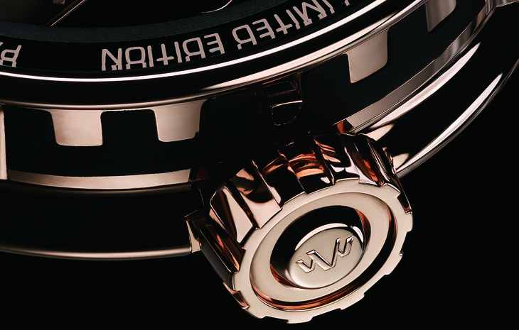 腕表多处细节均呼应品牌专属的标誌,当中包括42.5mm圆形表侧的DEWITT帝王柱图案、饰有"W"字样的表冠、表背及表带扣,展现腕表的尊贵地位。