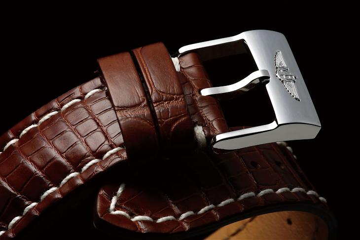 同样是皮带,百年灵也有牛皮和鱷鱼皮、针扣折叠扣可供选择,以飞行表来说牛皮带加针扣似乎才是王道,不过鱷鱼皮的精品形象跟半金也很相配,折叠扣在这裡也就显得顺理成章了。
