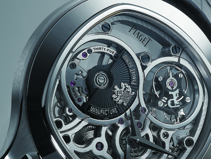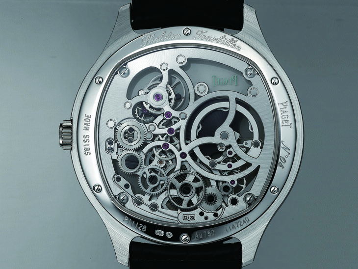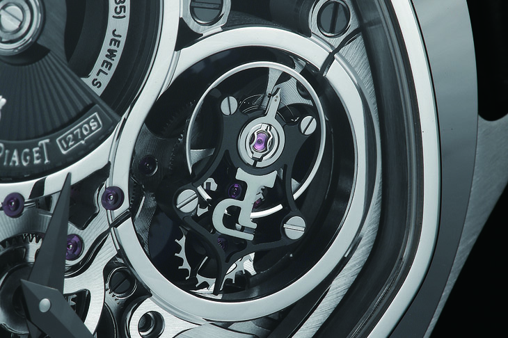 鏤空超薄机芯是一门极臻精巧的工艺,讲求以精微的雕刻细工鏤空金属,同时无损机芯耐用的机械构造和精确可靠的性能,由此,也相当考验工匠技艺,唯有技术嫻熟的资深工匠可以完成。而1270S自动上鍊机芯所展现出的成果,确实让人欣赏。这枚机芯歷时叁年研究方得完成,在5.05mm的方寸空间内,装载了225枚零件,经过工匠仔细鏤空,确保了运作上的准确无误,除此之外,也带来了极致的视觉享受。赏玩整体机芯,因鏤空设计而呈现的透视感,在光影的映射下特别突出。除了其上气派的陀飞轮之外,这枚机芯还採用了复杂的倒置结构,机芯上下倒置,令铂金自动盘和表桥可以从表面上一览无遗,极具机械美感。偏心式微型自动盘和陀飞轮上饰有PIAGET的"P"字标记,两者交错拼凑成幸运数字"8"细致的拋光效果与经雾面磨砂修饰的表桥形成悦目对比。在细节部分,亦可见识到品牌的超卓工艺,包括以銼刀施展的手工倒角修饰以及亮面拋光打磨,这些精妙的润饰为表作带来更丰富的艺术性。仔细观察,还可在机芯上见到鐫刻的品牌