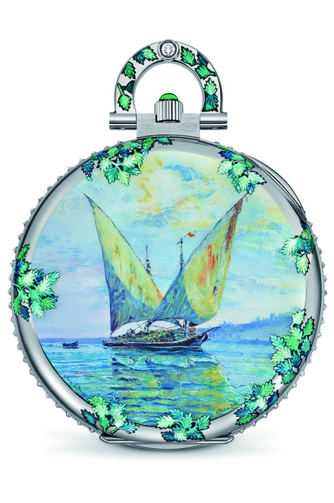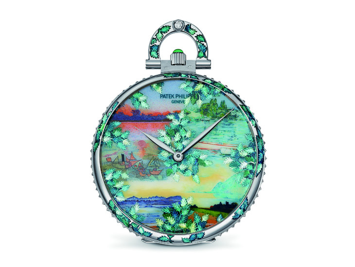 腕表背面Anita Porchet绘制出日内瓦湖的湖畔风光,总裁Thierry Stern童年时期在日内瓦湖畔度过许多美好时光,因此怀表极具纪念意义。