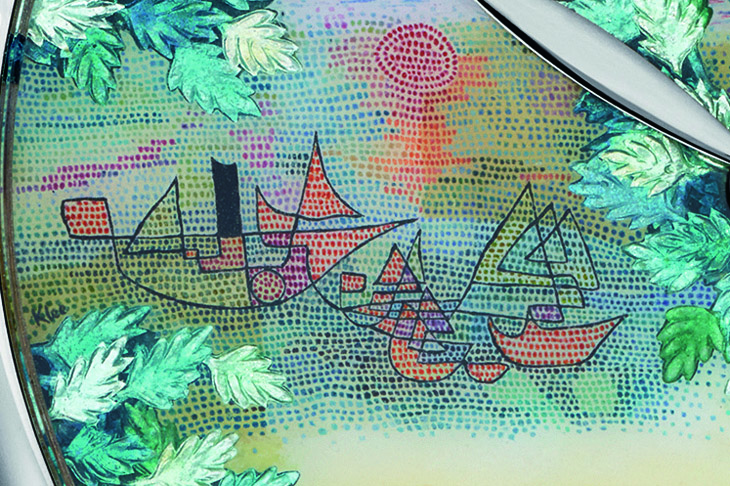 在这40款工艺系列作品中,最引人注目的为Dawn on the Lake怀表,品牌邀请珐琅彩绘大师Anita Porchet打造这只怀表。在面盘的正面上,Anita Porchet採用她最拿手的微缩珐琅工艺,使用极细的笔刷绘制多层的半透明涂层,再经过多道锻烧工序,整个绘制的过程需要耗时数月之久。仔细看怀表正面面盘上,可以看到Anita Porchet首次融合5幅风格不同的艺术作品,而这5位画家分别为:Paul Klee、Alexandre Perrier、Edouard Vallet、Mafli 和Ferdinand Hodler。其中最特别的是位于9点鐘位置的Paul Klee画作,原版画作中他使用点描派技法绘制(利用人视觉上的错觉,使用小点绘制而成的画作),而在怀表的面盘上可以看到Anita Porchet模仿了他的技法,难度加深之餘她还能完美地在微小的面盘上忠实呈现Paul Klee的画作,令人讚嘆她精湛的珐琅工艺。怀表的背面则绘制了帆船徜徉于日内瓦湖的景象,突显怀表的纪念意义。