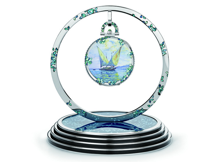 珐琅大师将5幅不同画家的画作结合在怀表的面盘上,甚至模仿点描派的技法。她向本刊透露,这是她首次模仿点描派的技法于微小的面盘上。