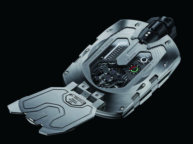 如同一艘精密神祕的太空船,表壳的表底保护盖可被打开,呈现另一个精心设计的时间宇宙,为腕表造型增添科技况味,十分独特。