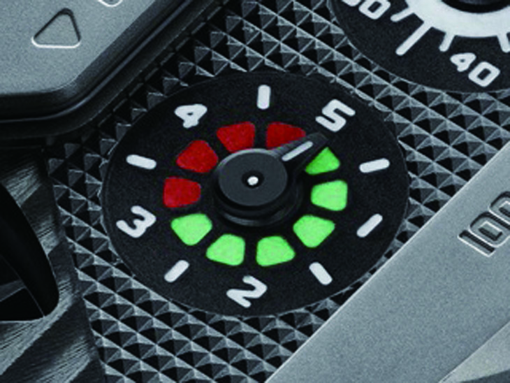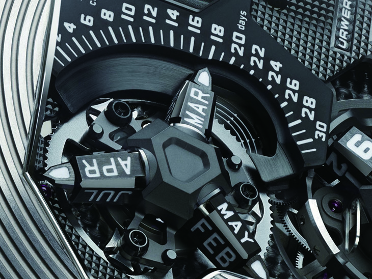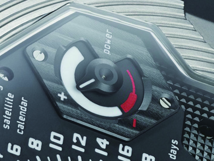 旋转卫星日期边的是动力储存显示,UR-10.01机芯发条提供39小时动力储备,因此动力储存显示尤见重要,以时刻提醒表主上鍊。