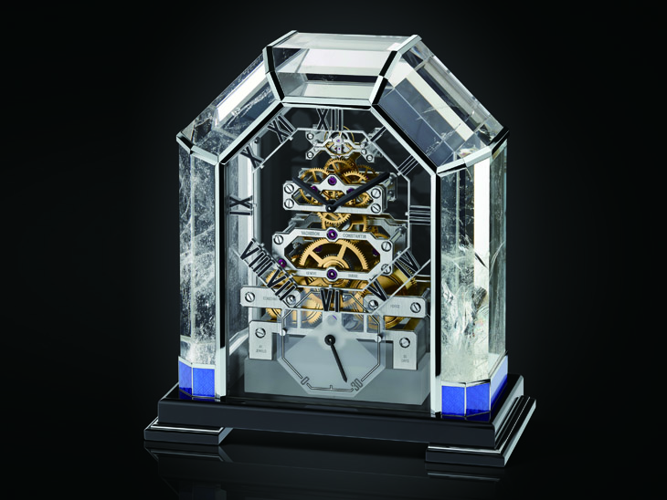 2015年江诗丹顿在座鐘上大显身手,品牌为Métiers d'Art系列新添上12款水晶座鐘,这些作品将在这一年内陆续推出,而率先登场的首款作品光华四射,水晶的璀璨之美融匯鐘表艺术,呈现一道凝聚建筑美学的迷人风景。