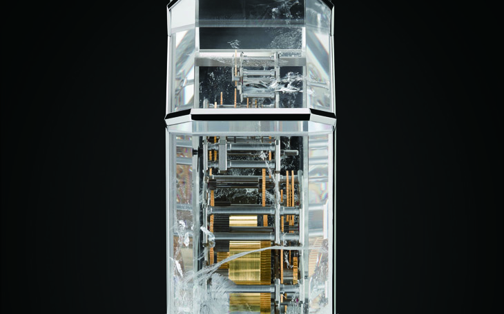 柜体採用24K镀金BACCARAT水晶制成。切割大师将其切成数小块,座鐘拱门结构的五块水晶经过拋光和雕刻成型,最后一块水晶用于支撑座鐘机芯。