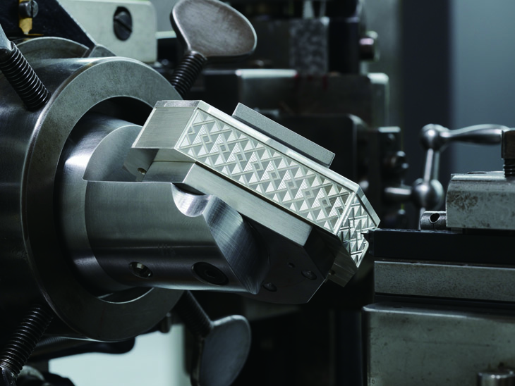 银质底座饰以手工机刻雕花图案。因底座与整个座鐘的拱形结构融为一体,需将雕花工艺延伸到构成拱形的五个水晶面上,使此步骤难度大增,考验手艺。
