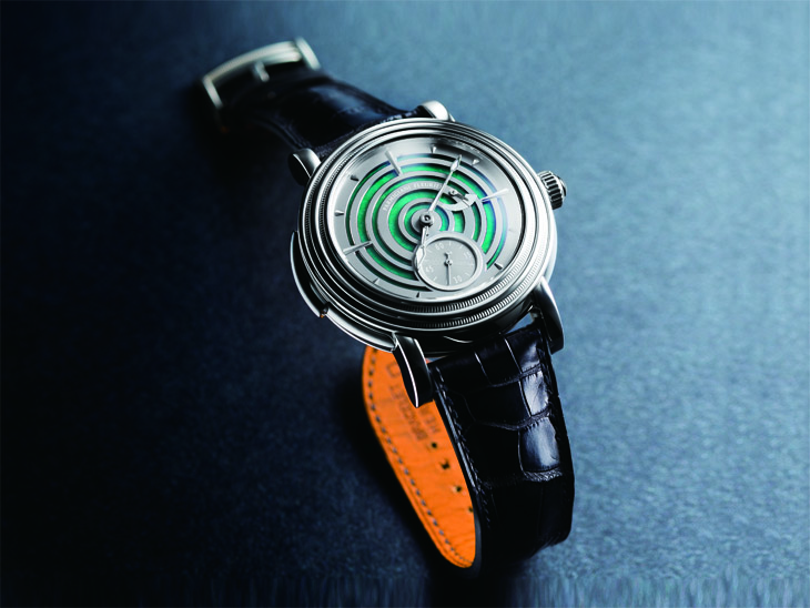 以同心圆设计将盘面打造成迷宫一样的神祕魅力,悠扬的音阶在时间当下被敲响,乐音旋律随即从迷宫中某处迴盪而出,交响着令你我着迷的音律,纯粹而美丽。