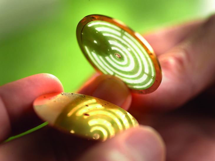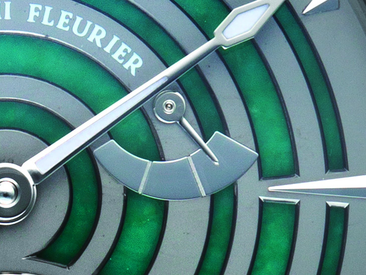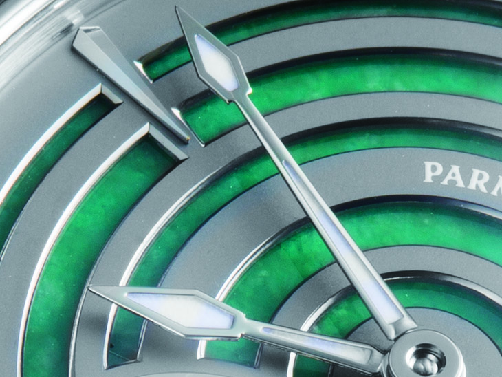 在希腊神话传说中,迷宫最初由建筑师代达罗斯(Daedalus)发明,用来禁闭人身牛头怪物弥诺陶洛斯(Minotaur),随着时序推进,迷宫在不同文化中蕴含的意义被不断扩展,但唯一不变的是其令人茫然、神祕的特质,令人恐惧,也令人不禁想要征服。在46mm的950铂金表壳下,藏着的是帕玛强尼的迷宫,其以两层结构组成,垫于底层的是一圈极珍贵的缅甸翡翠,绽放翠绿色泽,而安于上方的则为一个从中央延伸而出的同心圆鏤空白金面盘,形成一错综有致的迷宫式设计。这层白金盘面首先经过电脑数控(CNC)机器的加工,再进行精整,整个过程超过35小时,每处线条轮廓皆以手工进行倒角加工,相当考验工匠耐心与技术。
