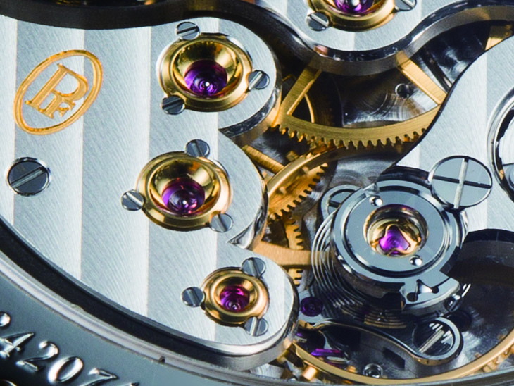 内搭的PF357手动上鍊机芯透过底盖可欣赏到其精细的打磨细节,其更特别装配调速轮,可确保发条能持续供应能量及令叁问报时装置无任何杂音地运行。