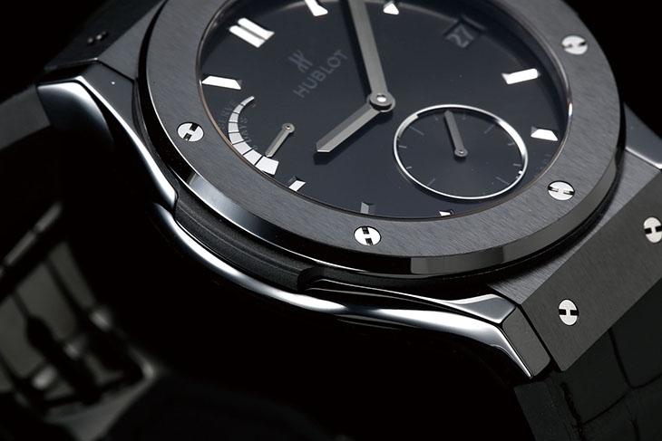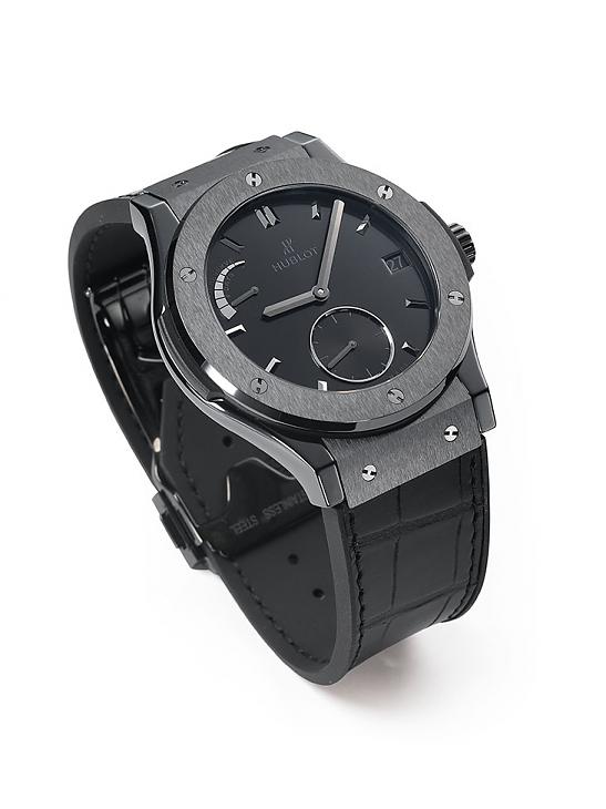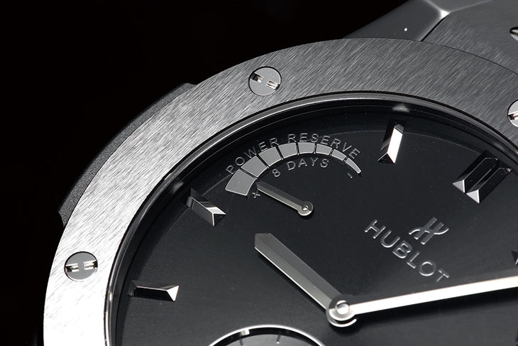 表款本身的格局工整,小秒盘方位正中,儘管表径高达45mm,秒针的轴心也没有太靠近中央的问题,说来这也要拜机芯直径有33mm之赐;日期窗和动力储存显示一右一左,尺寸和水平位置的差异巧妙地让表面达到平衡。由于面盘简单,要表现精致感只能在细节上多下工夫,表款的小秒盘和主面盘之间做了有相当落差的层次,两者各自有不同的表面处理,交界处也有饰边收头,另外指针和时标也都採用了多面切割,凡此都可以看出表款在提升质感上的企图。表带採用了在橡胶衬里上嵌进皮质外层的做法,这种表带现在已经有一些品牌开始应用了,不过HUBLOT身为胶带表的本家做起来自然更有道理。