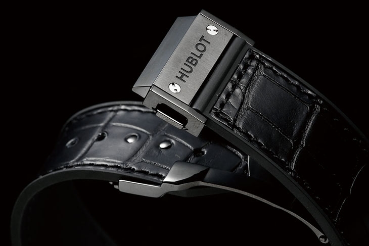 表款採用折叠扣。表带是在橡胶的衬裡上镶进鱷鱼皮,让它兼具正装表的质感,又不用担心皮件直接接触皮肤会有汗湿的问题,近年已有愈来愈多品牌导入。