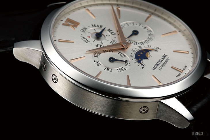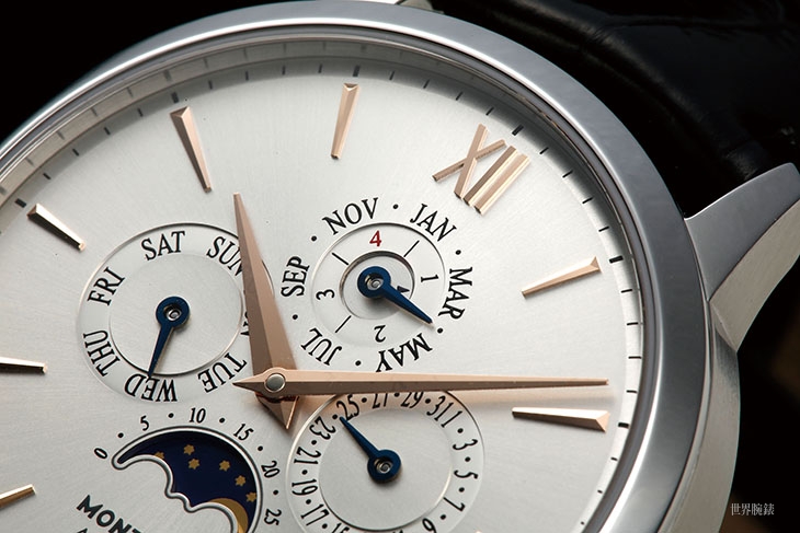 面盘的配置是很古典的格局,月份和闰年同轴,其他资讯平均地分布在表面;盘面的层次不多,整体来说很平,不过收头还是很妥贴,看起来仍然不失高级感。