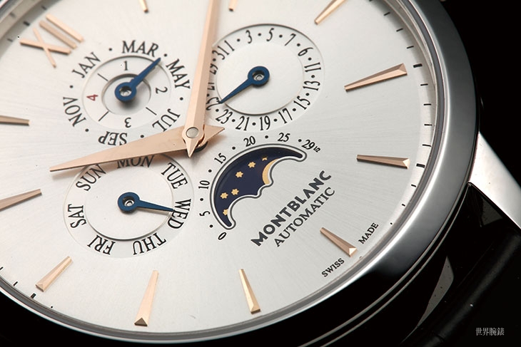 从外圈的月龄可以得知月相週期是最普遍的29.5天。时标的长短是新系列很妙的一点,万年历的表面太花可能看不出来,但看叁针款的话就会发现他的时标长短相当错落,不过意外地不失协调。