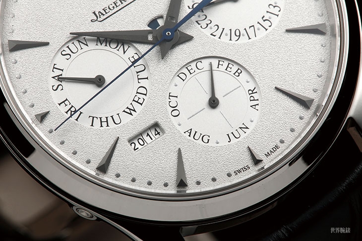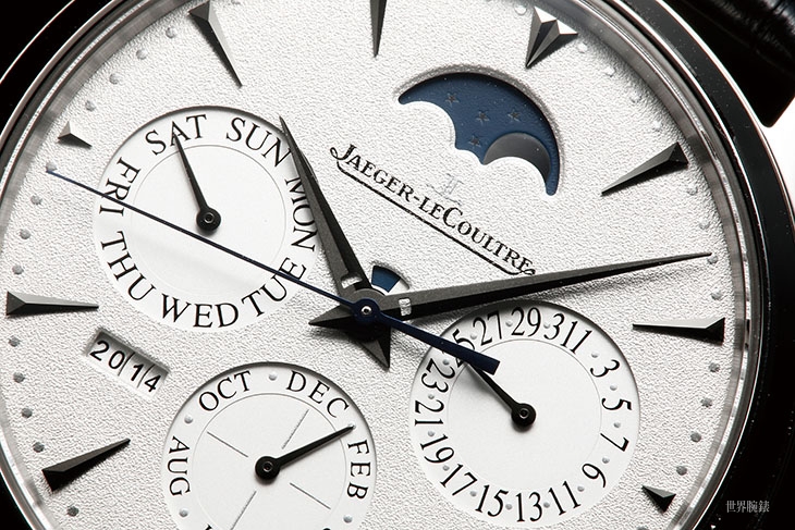 来看看表款本身吧。这款万年历的面盘配置跟积家近期的万年历款式都不太一样,不过同时又看得到它沿用了不少品牌相关表款的机能。其中四位数的年份是一个,另外面盘中央的午夜调校警示也是,这个视窗平时是白色的,一旦机芯进入换日程序,也就是逼近午夜的时候,视窗就变成蓝色的(贵金属款是红色的),提醒你这个时段不宜调校,而为了不要遮住视窗,时分针的基部还特地鏤空。这两项功能现在在积家的万年历表上头几乎都看得到,已经可以算是品牌万年历的一个特色了。
