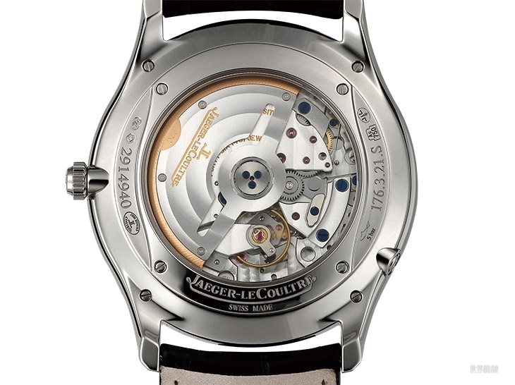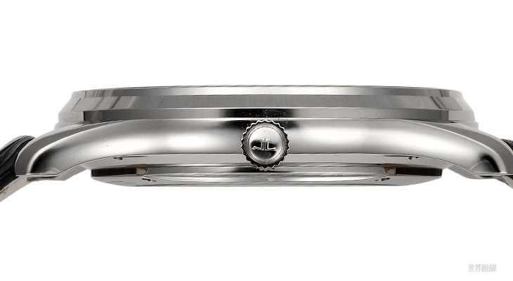 面盘採用了梨地的粒面表面处理,这是积家近年来爱用的面盘样式,用于白面的正装表有一种斯文气质,如果用于黑面的运动表的话也别有一种復古的味道,积家在这裡算是相当得心应手。白K金款和不锈钢款两种白色金属款,面盘上的指针和时标都做了黑化处理(不过两款的处理方式好像不太一样),以这款来说指针时标和底下面盘的对比较为强烈,相对地玫瑰金款直接採用同色(玫瑰金)的指针和时标,整体看起来就和谐得多。附带一提,表圈样式也很特别,有点像是烟囱式的不过又没那麼突出,搭配薄型的表身非常有味道。