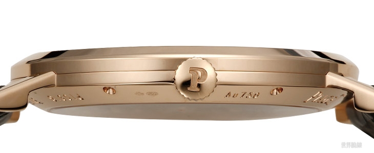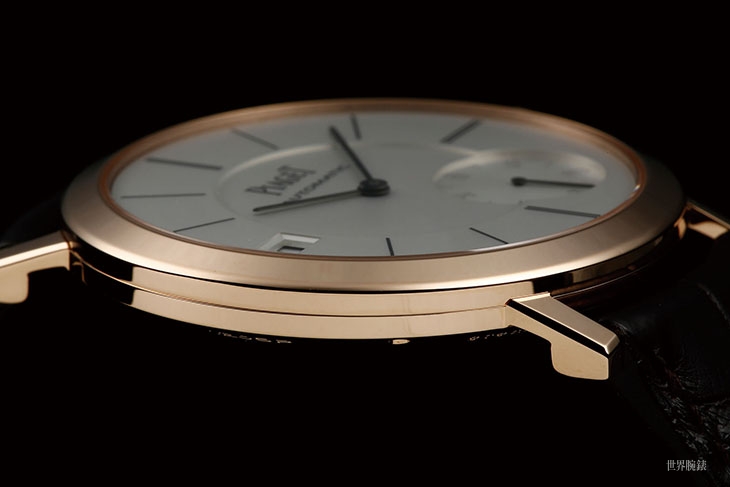 1205P多了日期模组,厚度从原本的2.35增加到3.00mm,虽然仍然算是个很薄的数字,不过以比例来说其实增加了很多,然而从表款的整体表现来看,我认为伯爵似乎并没有太拘泥于这一点。表款的直径40mm,比无日期款的小了3mm,厚度则从5.25增加到6.36mm;一般来说厚度增加了,为了要维持视觉上的纤薄感觉应该要增加直径,当然43mm作为正装表已经很难再往上加了,不过至少也应该保持住这个大小,然而这款却反而缩小了表径,因此表款整个侧面的比例看起来其实是比无日期款厚了不少的。