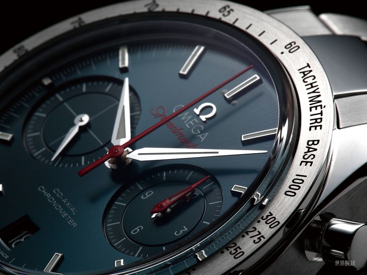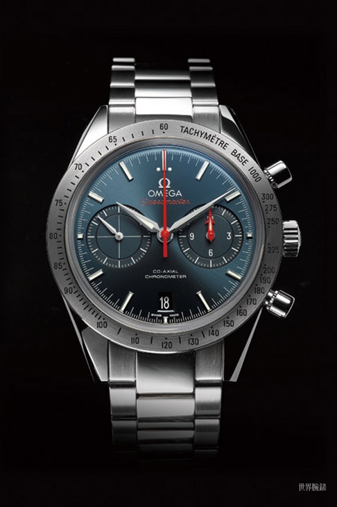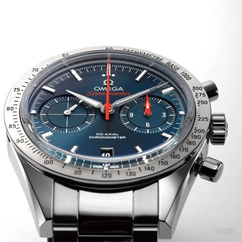 9300同轴擒纵机芯除了在精准度上有所提升,配备此机芯的表款拥有明显异于该品牌其他表款的表盘设计,不同于代表性表款的超霸表,以及其他OMEGA 计时码表的叁个小计盘特色佈局,而只有两个小计盘。小秒针指示依然位于9点鐘小计盘,但12小时与60分鐘指示则共同座落在3点鐘小计盘,让读取码表计时时间变得更加直觉。而6点鐘的日期显示则强化了表款本身的清晰读时功能,亮丽的蓝色面盘与红色指针,更一气呵成出Speedmaster '57的高科技氛围。