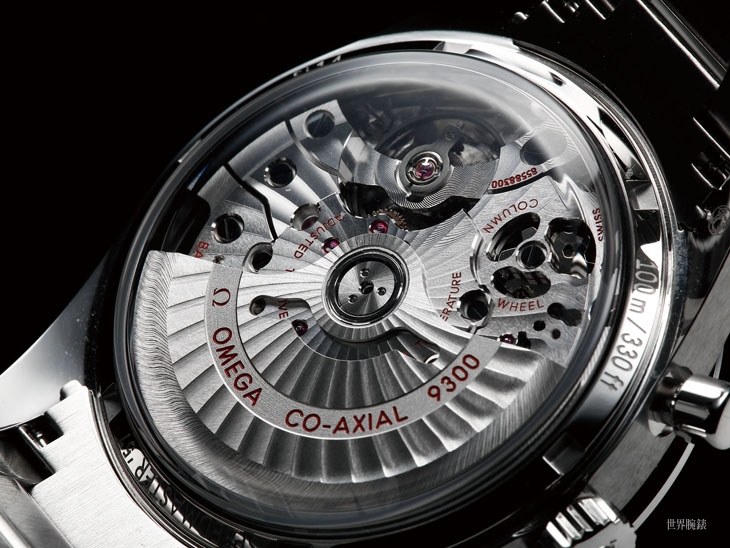其摆轮採无卡度设计,其运作明显不同于传统槓桿擒纵装置的快慢针式摆轮。圆形摆轮内嵌四枚金质调校小螺丝,可用来调整摆轮的惯性力矩,进而改变表的计时速率。这种设计排除了游丝与快慢针接触所造成的干扰效应,确保同轴擒纵装置能够长期提供稳定的计时速率。其最终效果便是减少摩擦,也就是说几乎不需要润滑油。同轴擒纵机芯拥有更长的保养维修间隔期,而同轴擒纵9300採用硅晶体游丝,并提供四年保固,相当实用可靠。