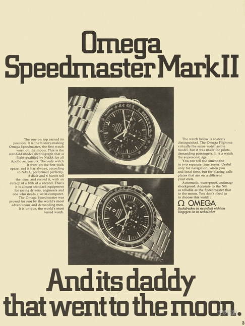 从早期品牌广告中,可以见到超霸Mark II与登月表之间的传承脉络,当时市场因为861机芯通过登月任务的挑战,而对同样搭载该枚机芯的Mark II腕表深具信心。
