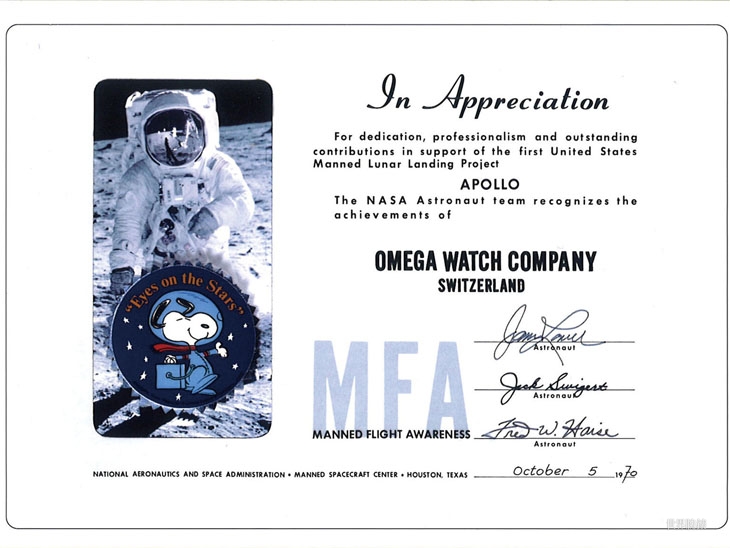 OMEGA旗下的Speedmaster超霸腕表在1957年时首度问世,至1960年代初期因缘际会被选为太空人升空任务佩戴的候选表款,后于1962年时太空人Wally Schirra曾佩戴一只OMEGA超霸腕表顺利完成水星号太空任务,初步证明超霸表的坚实水准,同时间美国太空总署NASA也开始就候选的腕表进行一连串严格检测,1965年超霸表力压他厂腕表,凭藉顺利通过每项测试的高档表现而从此被NASA指定为官方太空任务用表。不过超霸表之所以声名大噪的关键效应,或许还是至1969年的跨时代大事中才逐渐发酵,当时超霸表伴随阿波罗11号的传奇太空人们共同写下人类首次成功踏上月球的纪录,因而让「登月表」的美名不脛而走。超霸表对太空任务的重要性,从1970年代OMEGA获颁美国NASA的Snoopy Award史努比奖章亦可见一斑;在阿波罗计画如火如荼进展期间,史努比漫画的影响力也蔓延至专业太空人之间,成为他们閒暇时的生活话题,其后遂因史努比的友善形象而被NASA选取作为太空任务奖章的代言者,OMEGA的超霸表因在1970年5月的阿波罗13任务中,成功辅助太空人们度过太空船机体爆炸意外,使所有船上成员得以平安返航,而获得史努比勋章殊荣。凡此种种与太空任务的合作事蹟,让OMEGA的超霸表躋身表坛极少数能称之为太空用表的优质典范。