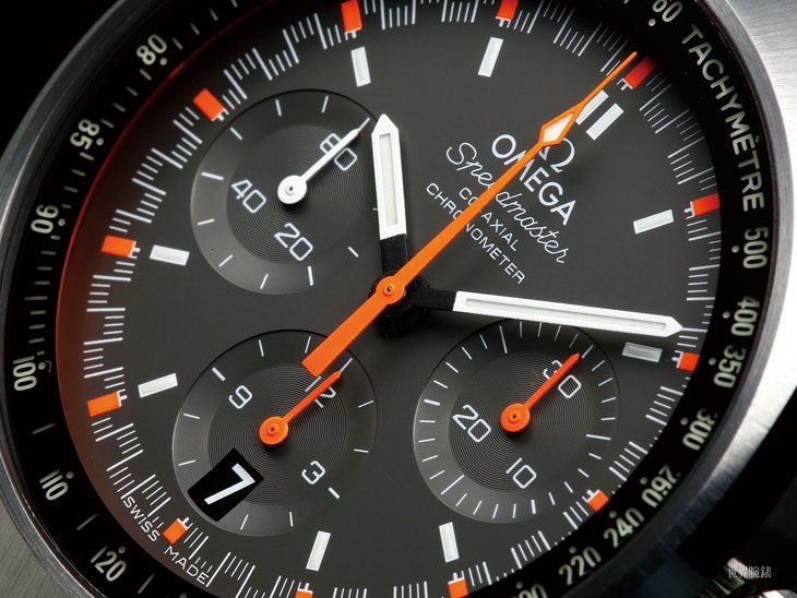 面盘外围分、秒刻度的上下交错形式,加上共有橘色涂层与夜光涂层的双时标设计,使得超霸Mark II腕表的面盘外侧显得繽纷而活力十足,相对之下面盘内圈的叁眼表盘显得简单明快许多,为了区辨走时与计时的不同资讯,OMEGA在中央计时秒针、3点位置的计分针以及6点位置的计时针上同步採用橘色调,与中轴时、分针和小秒针的白针并列呈现出清楚明确的辨时性,此外6点方向日期转盘採黑底白字配置也能突显视觉层次而不易为佩戴者忽视。