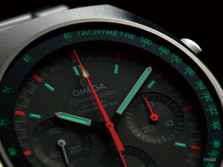 超霸Mark II腕表在光线足够之处因为橘色指针刻度与深灰色泽面盘的高对比度,而自有极易判读的显时功效,此外OMEGA也精心替时、分指针以及12小时刻度涂覆夜光物料,使其在黑暗环境中仍能持续作为佩戴者读时的可靠辅具。值得一提的是品牌在面盘外圈的铝金属流速计刻度环下镶附有一层Super-LumiNova涂料,使流速计刻度在黑暗中能呈现由下方散射出的绿色夜光,隐隐有种状似电子显示的奇特观感。
