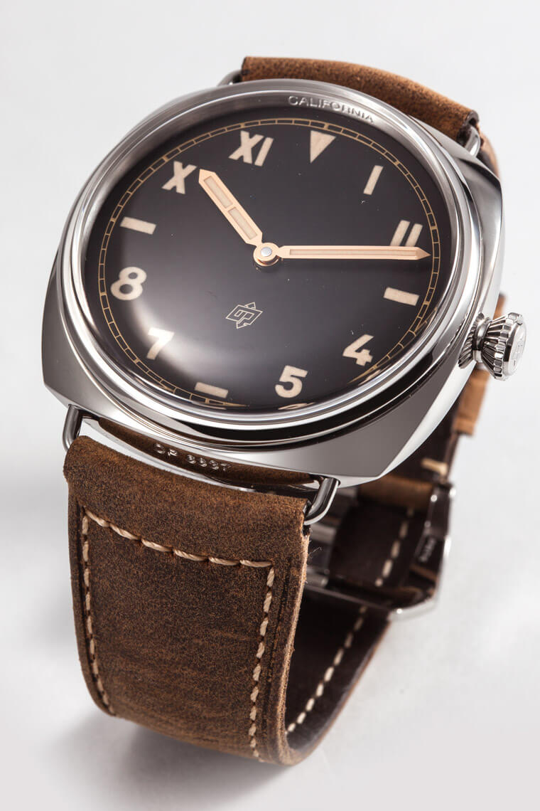 那麼加州面盘又是怎麼诞生的?关于加州面盘的设计背景有好几种说法,如今比较可信的是加州面盘来自一家成立于1926年位于美国加州的面盘修复公司Kirk Rich Dial Corporation,而为什麼要生产这麼奇怪的读时布局,这种上半部是罗马数字、下半部是阿拉伯数字的加州面盘,诞生于1936年,为了让义大利海军在深海可以便于读时,加上夜光涂料的使用,更是强化了读时的直觉性,以及沛纳海巧妙的将面盘时标设计成清晰的显时数字——罗马数字与阿拉伯数字参半的面盘,而且在3、6、9 等位置以一个精简的"—"作为时标,至于12 点钟位置则以倒三角的符号标示,最后在接近表圈的位置作出一轨道式的分钟刻度,让使用者能够一目瞭然。