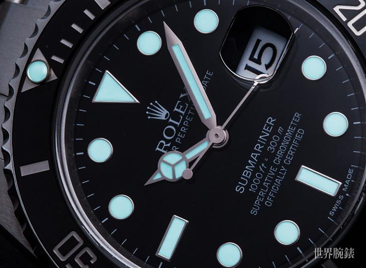既然被称之为水鬼,防水性能自然是Submariner Date的优势所在,这点从劳力士腕表作品中表冠皇冠底下的点或槓可以透露些端倪(因为这关系到表壳的材质或是防水规格),Submariner Date的表冠皇冠下方有三点,代表的意义是三重防水,也是劳力士表冠防水的最高规格,因此表款的防水来到300米,虽然市面上有其他更吓人防水规格的潜水表,但要说到真正派上用场,300米已经绰绰于有。附带一提,一般皇冠下方的一点是指铂金壳,两点是指K金壳,一槓是未强化防水的不锈钢壳。不只是防水性能,在水下黑压压的环境,表款面盘清楚的视读性也同样重要,劳力士的夜光涂料在2006年以前用的是常见的Super-Luminova,2007年以后改用自家的Chromalight,所以现役的Submariner Date刚好搭上了这波换料潮,Chromalight物料号称发光时间能延长一倍,顏色也由绿转蓝,多了些劳力士本身的识别度。