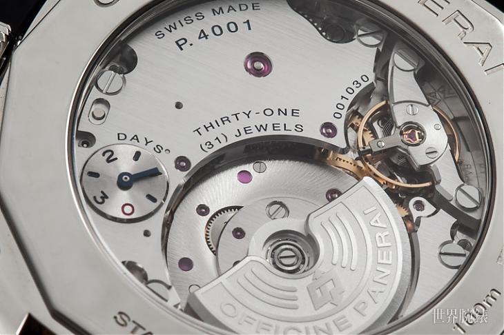 刚刚有提到沛纳海657所搭载的P.4001机芯前身来自P.4000,这枚厚度仅3.95mm的瘦身机芯比起沛纳海以往的自动上链机芯来说,真的显得轻薄很多,譬如P.9000机芯厚度就是7.9mm,这款轻薄P.4000机芯的诞生其实恰恰好预示了沛纳海想要耕耘商务人士这一块市场,P.4001的推出是P.4000加装GMT两地时间功能、动力储存显示以及日期功能,这对平常两地跑的商务人士而言相当实用,而P.4001的兄弟机芯P.4002和它只有一个差别,就是P.4001的动力储存在表背,P.4002则是放置在正面的面盘,这让表款拥有更多元的弹性设计,因为将动力储存设置在表背的好用之处是面盘多了更充裕的空间,同时也让读时变得更简单。