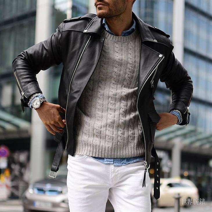 黑色骑士风皮衣与灰色毛衣、白裤的黑白灰渐层搭配,内搭的蓝色丹寧衬衫,从领口、袖口与衣摆微微露出,带出休閒感,腕表白色面盘与白裤巧妙呼应,基本色系搭配乾净又高雅。不只色彩的搭配,毛衣、皮衣、丹寧与钢表,异材质的组合却和谐、完整度高。透过搭配穿出骑士风皮衣的休閒优雅、绅士风,再搭配一支品味运动表,这时画龙点睛,大家都会说你好帅!