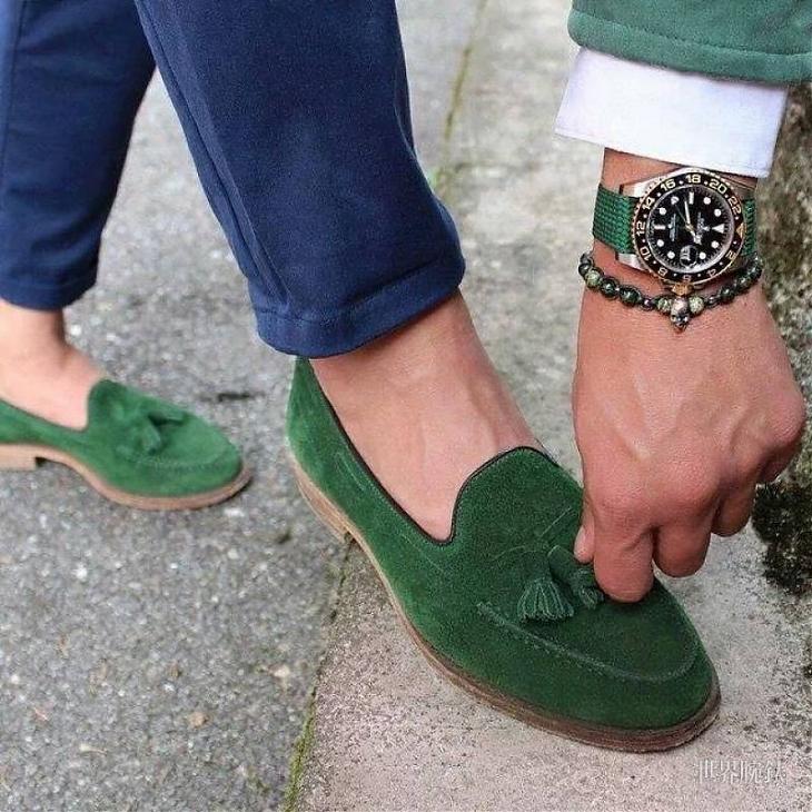 黑金款式的ROLEX GMT-MASTER II,更换成深青绿色NATO帆布表带,让ROLEX黑金款式的霸气与狂野,更增添几许腕表休閒感。搭配深浅不一的翡翠色手环,腕表与手环色调相同,更突出主角色,大幅提升时尚度。搭配同色调深青草绿的莫卡辛鞋(Moccasin),麂皮或软皮制成的莫卡辛鞋柔软而灵活,流苏洋溢着慵懒舒适的氛围。将一派閒适穿搭在身上,腕表隐隐显露ROLEX王者霸气,高明的绿色系搭配,让慵懒閒适的氛围渲染所有街景吧~