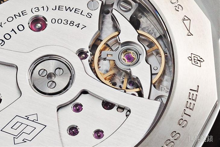 从P. 9000到9010最重要的规格变更就是厚度,而能够削减掉这些厚度主要是靠改换了双向自动上鍊机构。之前P. 9000的上鍊机构使用的是类似Magic Lever的鉤爪机制,而9010所使用的,虽然官方资料并未提及,不过从外观来看应是切换轮机制无误。一般认知两种上鍊机制之间的优劣是Magic Lever构造简单,较为安定,而切换轮则是体积较小不佔空间,既然9010的首要任务是缩小尺寸,由Magic Lever改换成切换轮自然是最合理的选择。